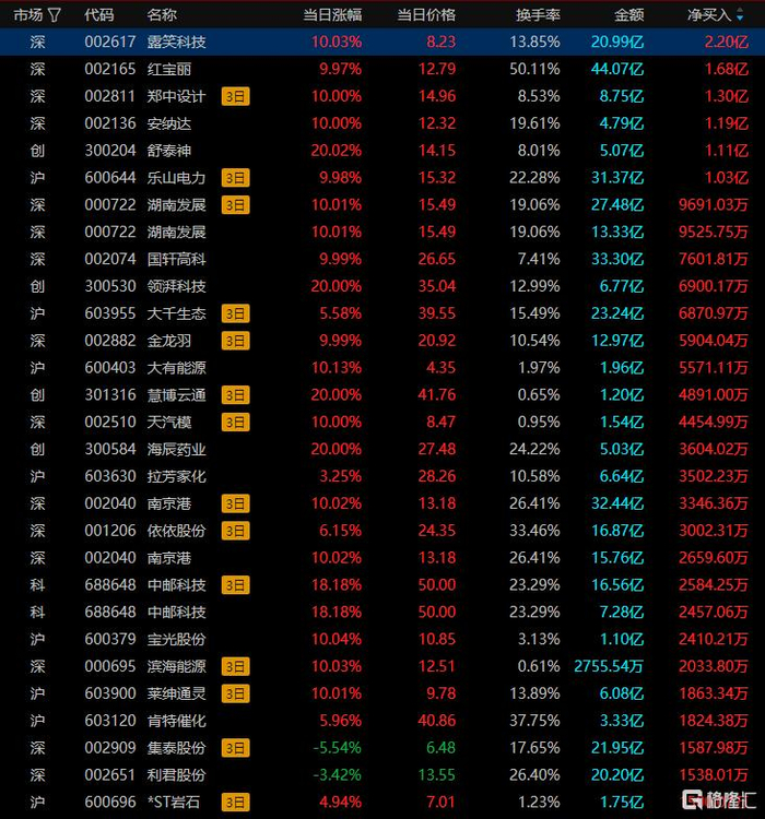 龙虎榜单日净买入额前三为露笑科技、红宝丽、安纳达,分别为2.2亿元、1.68亿元、1.19亿元。