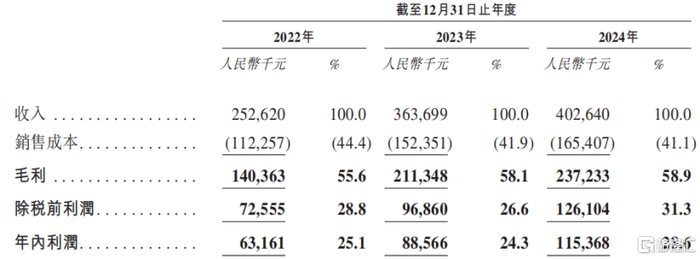 2022年、2023年及2024年(报告期),公司的总收入分别为2.53亿元、3.64亿元及4.03亿元;年内利润分别为6320万元、8860万元及1.15亿元。毛利率分别为55.6%、58.1%、58.9%,净利率分别为25.1%、24.3%、28.6%。