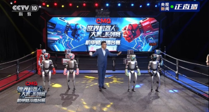 格隆汇5月25日|《CMG世界机器人大赛·系列赛》机甲格斗擂台赛今晚举行,这是全球首个以人形机器人为参赛主体的格斗竞技赛事。正式开赛前,四台宇树G1人形机器人戴着不同颜色的护具亮相,并分别展示了勾拳、踢腿等动作。