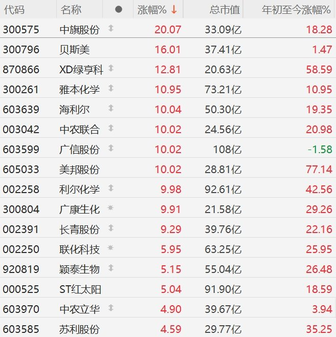 A股市场农药股集体拉升,其中,中旗股份20CM涨停,雅本化学涨超15%,海利尔、中农联合、广信股份、美邦股份、利尔化学10CM涨停,ST红太阳5CM涨停,贝斯美、广康生化、长青股份、联化科技跟跟涨。