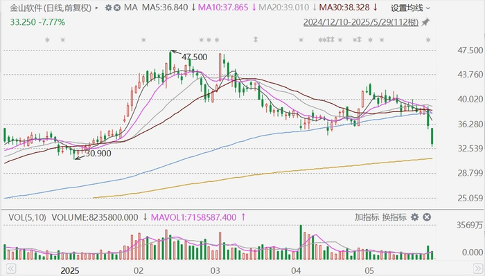格隆汇5月29日|延续昨日跌势,金山软件(3888.HK)今日再度下跌,盘初一度跌近9%,报32.85港元,股价创今年1月以来新低。