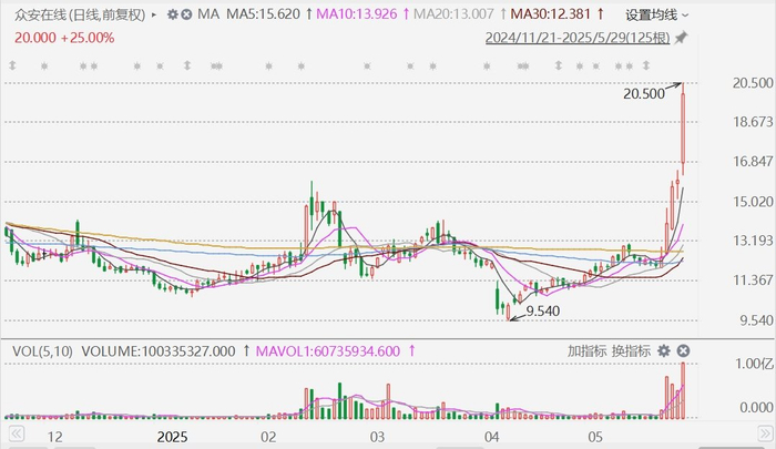 众安在线(6060.HK)今日大涨,盘中一度飙升28.13%报20.5港元,创去年10月以来新高。该股已连续第五日上涨,累计最大涨幅逼近70%。