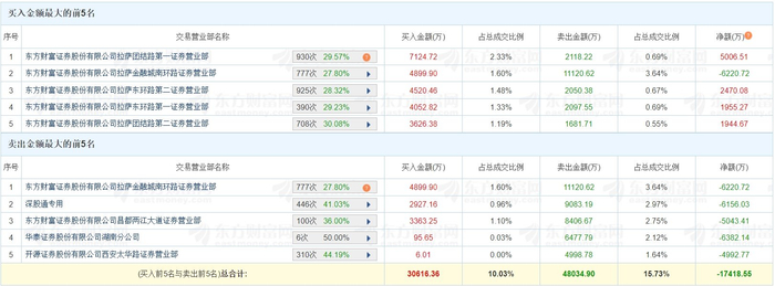 格隆汇5月30日|此前5连板涨停的融发核电(002366.SZ)今日跌停,换手率32.59%,成交额30.53亿元。龙虎榜数据显示,买方的前五个席位均为东财“拉萨天团”,净买入5156万元;深股通位列卖二席位,净卖出6156万元;游资“量化打板”位列卖五席位,净卖出4993万元。上榜席位全天买入3.06亿元,卖出4.8亿元,合计净卖出1.74亿元。(格隆汇)