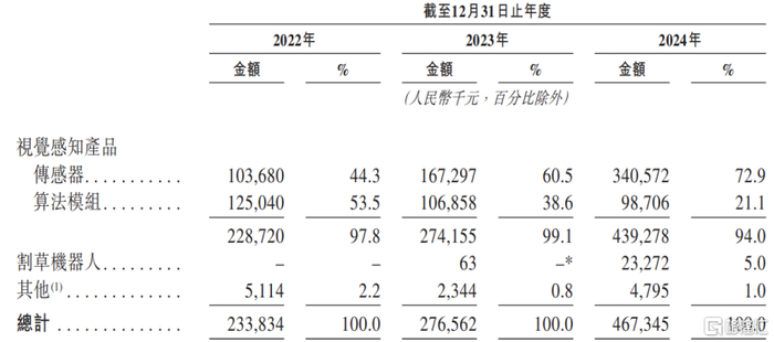 2024年,视觉感知产品的收入占公司总收入的94%,其中传感器占比72.9%,算法模组占比21.1%,割草机器人销售占比5%。