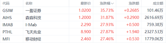 格隆汇6月6日|中概股收盘涨幅前五的个股为:一盈证券涨35.73%,森淼科技涨31.87%,I-Mab涨27.93%,飞天兆业涨27.87%,移动财经涨27.46%。(格隆汇)