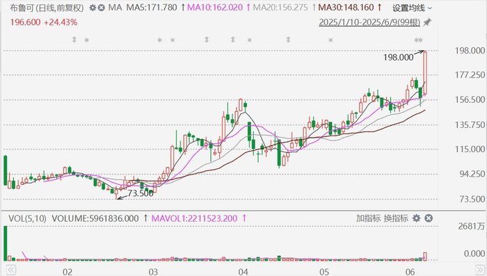 格隆汇6月9日|布鲁可(0325.HK)拉升涨超25%,报198港元,股价创上市新高,市值逼近500亿港元,截至目前成交额放大至超10亿港元。消息面上,深交所和上交所分别发布公告称,将布鲁可调入港股通标的名单,自2025年6月9日起生效。