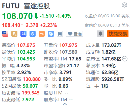 格隆汇6月9日|富途控股(FUTU.US)盘前涨2.23%报108.44美元。瑞银近日发研报指,维持对富途控股的“买入”评级,将目标价从141美元上调至149美元,基于加快的客户资产流入和活跃的交易量,目标市盈率为18倍(12个月远期市盈率)。(格隆汇)