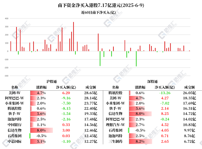 格隆汇6月9日|南下资金今日净买入港股7.17亿港元。其中: