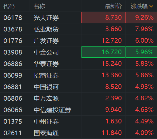 格隆汇6月11日|港股中资券商股拉升走强,其中,光大证券大涨超9%领衔,弘业期货大涨8%,广发证券、中金公司涨6%,招商证券、中国银河、申万宏源、中信建投等多股涨幅超4%。
