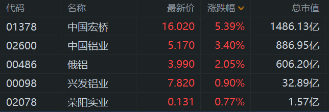 港股铝业股集体拉升,其中,中国宏桥涨超5%创历史新高,中国铝业涨3.4%,俄铝涨2%,兴发铝业、荣阳实业跟涨。