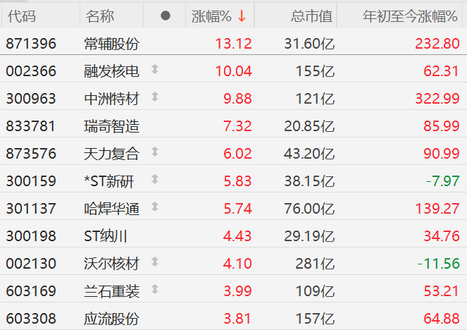 格隆汇6月12日|A股市场核能核电股集体走强,其中,常辅股份涨超13%,融发核电10CM涨停,中洲特材涨近10%,瑞奇智造、天力复合、哈焊华通、沃尔核材等跟涨。