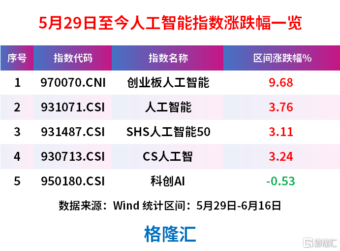 Wind数据显示,5月29日至今,与人工智能相关的指数中,创业板人工智能指数一马当先,以9.68%的涨幅遥遥领先同类指数。亮眼业绩得益于该指数一键布局算力硬件+软件+AI应用三件套,高效地捕捉AI主题行情,是当前市场“CPO”含量最高的人工智能指数。