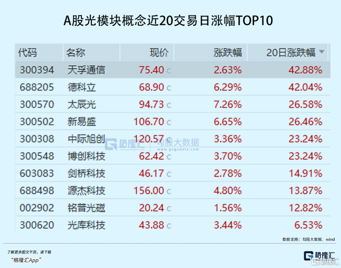 而上涨行情和热度均比较持久的板块,是光通信赛道。今天该板块继续维持景气热度,多只概念股涨幅超过5%,尤其是近20交易日来,多只个股累计涨幅已经超过了20%,其中天孚通信、德科立涨幅甚至超过了20%。