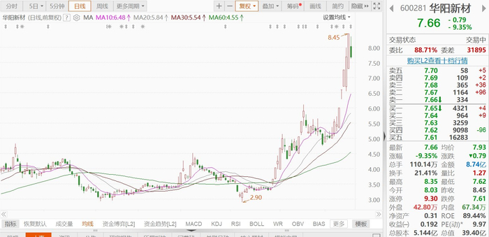 此前5天4板涨停的华阳新材(600281.SH)今日午后跌9.35%,报7.66元,总市值39.4亿元。华阳新材公告,近期公司股价出现大幅波动,累计涨幅已显著偏离行业整体水平。公司目前经营规模较小,资产体量存在一定局限性,市值规模亦相对偏低,客观上使得相关操作具备一定便利性。近期公司股价呈现出较为明显的上涨态势,综合来看,存在非理性炒作风险,敬请广大投资者理性决策、审慎投资。