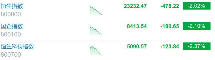 格隆汇6月19日|港股主要指数持续走低,恒指跌幅扩大至2.02%,恒生科技指数跌2.37%,国企指数跌2.1%。思摩尔国际跌超9%,阿里健康跌超4%,快手、舜宇光学科技、京东、哔哩哔哩、美团跌超3%。新消费概念股下挫,毛戈平、老铺黄金、布鲁克跌超7%,泡泡玛特跌超5%。