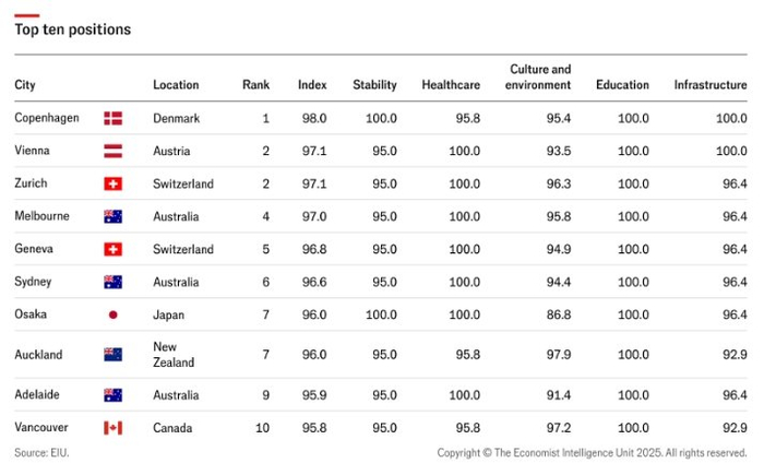 丹麦首都哥本哈根位居榜首,在稳定性、教育和基础设施方面获得满分,击败连续三年称霸的奥地利首都维也纳。前十位依次为:丹麦哥本哈根、奥地利维也纳、瑞士苏黎世、澳洲墨尔本、瑞士日内瓦、澳洲悉尼、日本大阪、新西兰奥克兰、澳洲阿德莱德、加拿大温哥华。
