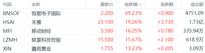 格隆汇6月27日|中概股收盘涨幅前五的个股为:恒星电子国际涨69.23%,禾赛涨19.26%,移动财经涨16.25%,联掌科技控股涨15.67%,鑫苑置业涨13.23%。(格隆汇)