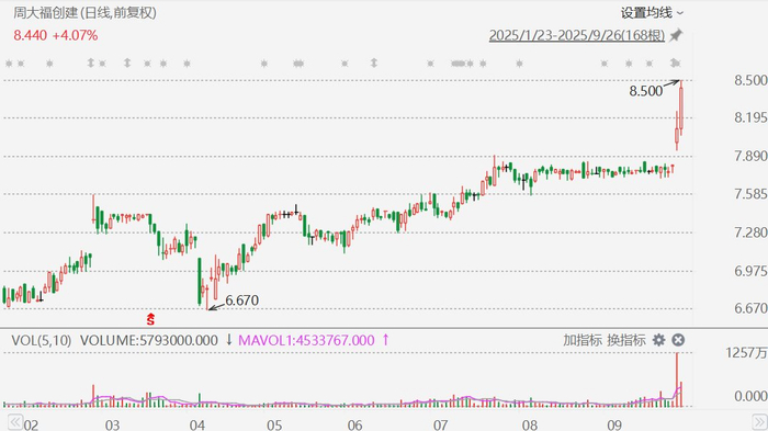 延续昨日涨势,周大福创建(0659.HK)今日逆势走强,盘中涨近5%,报8.5港元,股价创2019年4月以来新高。