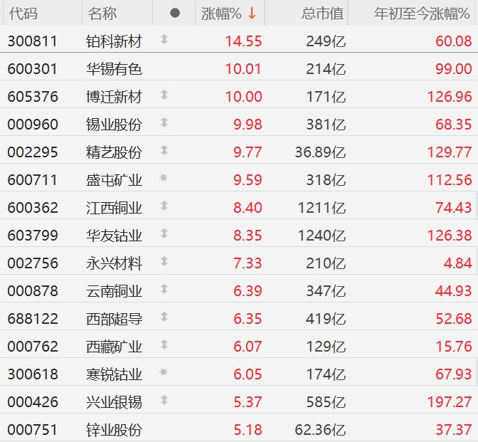 格隆汇9月30日|A股市场有色金属板块集体强势,其中,铂科新材涨超14%,华锡有色、博迁新材、锡业股份10CM涨停,精艺股份、盛屯矿业逼近涨停,江西铜业、华友钴业涨超8%,永兴材料涨超7%,云南铜业、西部超导、西藏矿业、寒锐钴业涨超6%,兴业银锡、锌业股份涨超5%。