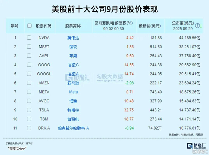 其中,美股科技巨头们表现多数亮眼。截至9月30日,美股股王英伟达月内涨幅约4.5%,苹果月内涨幅9.6%,谷歌、博通、台积电等月内涨幅均超过10%。最亮眼的无疑是特斯拉,月内涨幅达到了近33%,市值月内增加了近4千亿美元。
