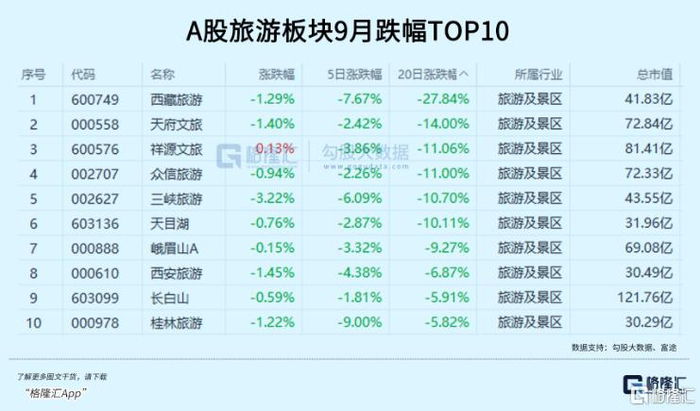 除了食品饮料外,旅游、休闲食品、家电等传统消费板块9月的行情中同样相对较为惨淡,成为跌幅榜中最缺乏关注度的存在,多数板块月内的整体跌幅均接近或超过10%。不过在此前,这些板块也在上半年也一度被资金抱团疯狂热炒,如一度十日翻倍的西藏旅游、二季度翻倍股天府文旅等,反而成为了9月份回调最多的标的。