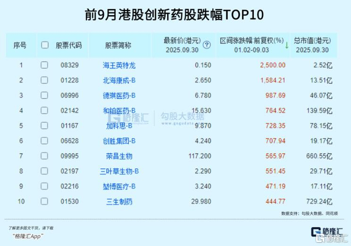 2025年,是A港股创新药板块表现最强势的罕见阶段。从年初至9月初,单是A股就有超过50只创新药股涨幅翻倍,舒泰神、一品红、塞力医疗等多股涨幅超3倍。港股的上百只创新药股中甚至一度有近60股翻倍,占比超过50%!其中海王英特龙、北海康成-B两只微盘妖票涨幅分别高达25倍、16倍,还有超十股涨超4倍。