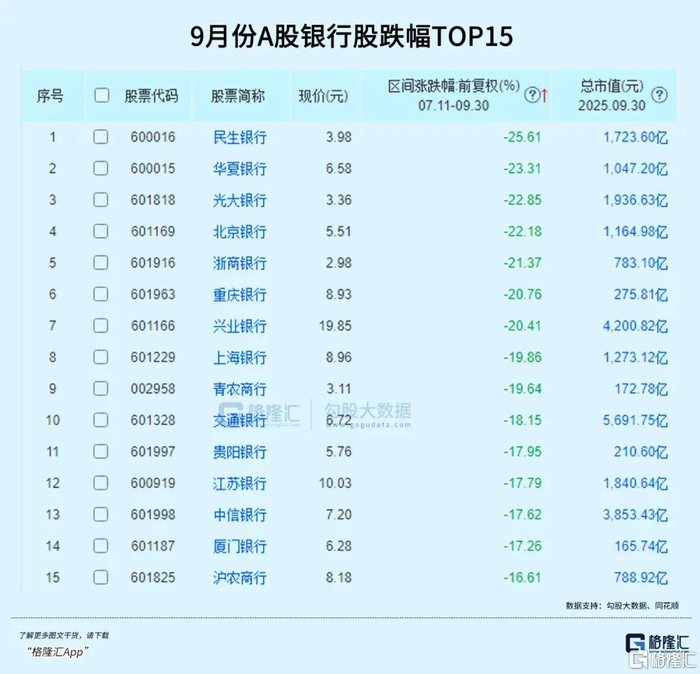 今年1-7月中旬,银行板块累计上涨超20%。然而随着A股行情越发走牛,市场风险偏好提升,大规模资金开始充银行撤出转向其他热门赛道,资金长期抱团的银行股也由此持续回调,38 家上市银行更是集体连跌三月。其中,民生银行、华夏银行、光大银行、北京银行等近十股期间累计回调超过20%。完全错过了这一轮牛市中涨势最舒服的阶段。