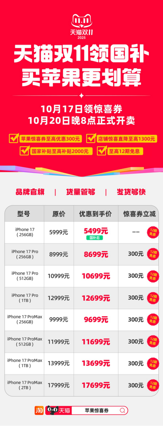 天猫双11活动期间,iPhone 17 Pro系列享惊喜券优惠300元,到手价低至8699元起。 iPad Air 11享店铺优惠1100元、叠加惊喜券及国补后,到手价低至3099元。AirPods 4三重优惠后到手价约679元。此外,店铺内还可使用12期免息、以旧换新服务等。