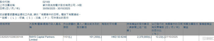 格隆汇10月30日丨根据联交所最新权益披露资料显示,2025年10月27日,贝克微(02149.HK)获RAYS Capital Partners Limited在场内以每股均价50.6248港元增持10.12万股,涉资约512.32万港元。
