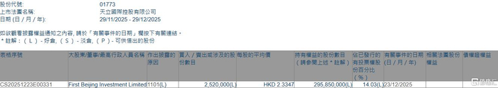 格隆汇12月29日丨根据联交所最新权益披露资料显示,2025年12月23日,天立国际控股(01773.HK)获First Beijing Investment Limited在场内以每股均价2.3347港元增持252万股,涉资约588.34万港元。