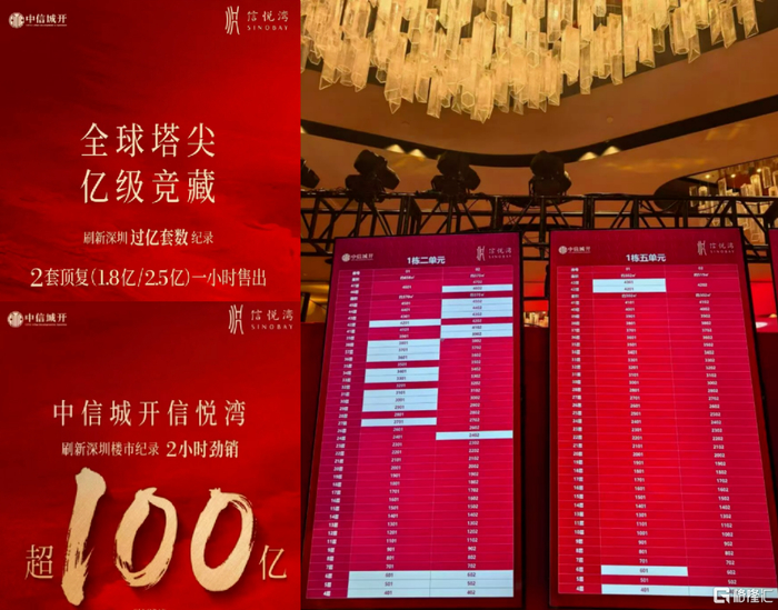 12月深圳中信城开信悦湾156套302~658平大户型,均价约24.4万,总价约5326~2亿5002万,开盘两小时销售约100 亿元。