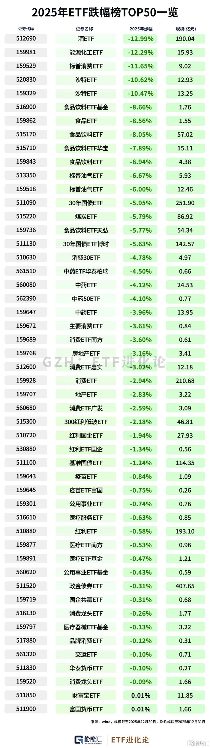 酒ETF、能源化工ETF、标普消费ETF、沙特ETF年内跌超10%。