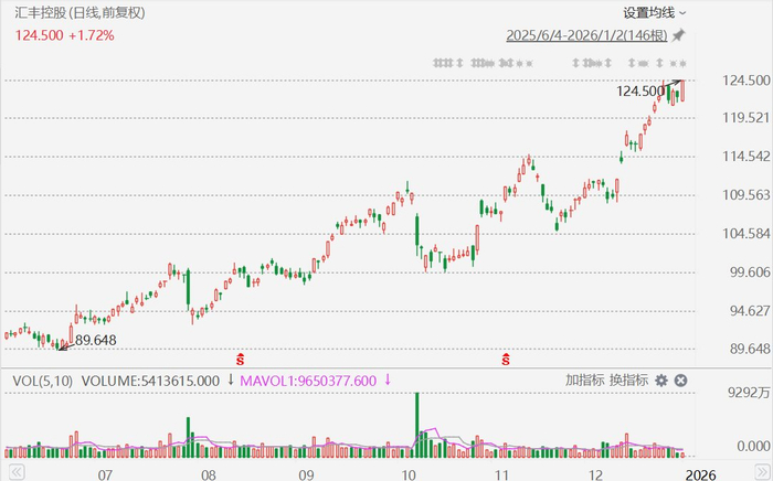 格隆汇1月2日|汇丰控股(0005.HK)涨1.72%至124.50港元,股价创历史新高。2025年,汇丰控股累涨70.57%。