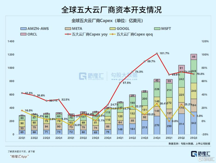 支撑这份需求的,是五大云厂商史无前例的“烧钱大战”。这些下游云服务商(CSP)的资本开支,正是英伟达业绩的核心先行指标: