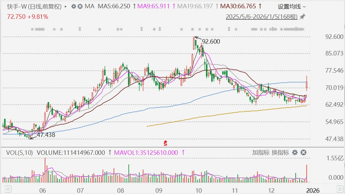 格隆汇1月5日|快手(1024.HK)今日表现亮眼,盘中一度涨超13%报75.25港元,创下3月以来最大升幅,截至目前成交额放大至81亿港元。有数据显示,快手人工智能(AI)模型可灵(Kling)在海外市场广受欢迎。