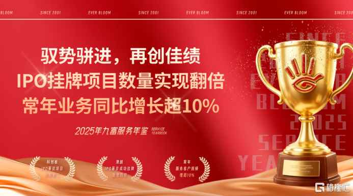 2025年,九富服务A股IPO成功挂牌项目总募资额,占A股2025年度总募资额近30%。其中,A股前二十名IPO募资项目中,近半数由九富提供服务,并包揽科创板IPO募资前两名;服务港股IPO成功挂牌项目同比去年激增四倍,境内外IPO业务全年捷报频传。