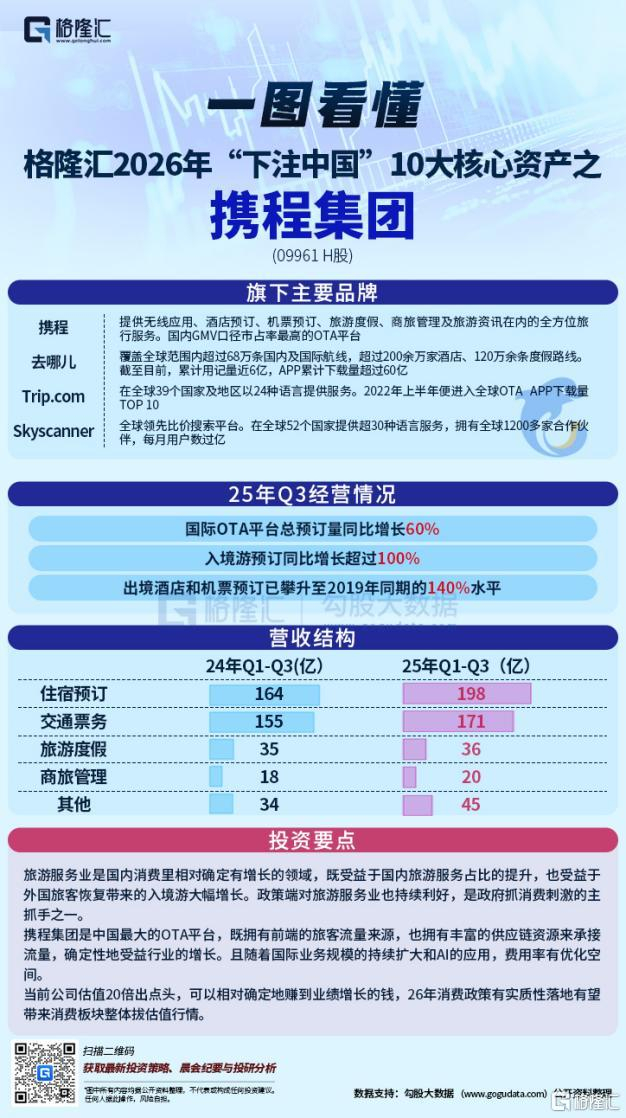 2026年度格隆汇“下注中国”十大核心资产已正式发布,携程集团(TCOM.US/9961.HK)历经多轮筛选与角逐,最终入选成为核心资产中消费旅游领域的标杆标的。