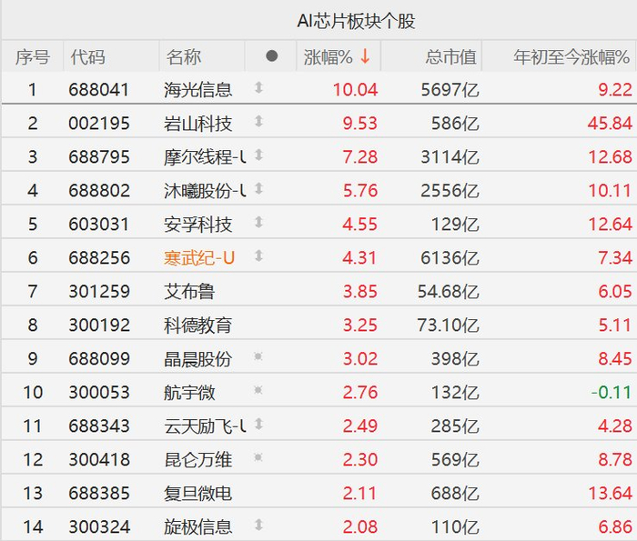 格隆汇1月8日|A股市场AI芯片股集体走强,其中,海光信息涨超10%,岩山科技逼近10CM涨停,摩尔线程涨超7%,沐曦股份涨超5%,安孚科技、寒武纪涨超4%。分析认为,半导体设备、AI芯片接连走强主要来源于全球半导体“超级周期开启”与国产芯片“国产替代深化”两大核心罕见共振。