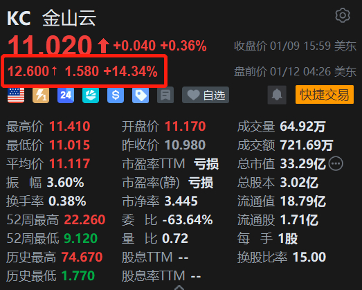 格隆汇1月12日|金山云港股受AI应用大爆发带动大幅收涨15%,金山云(KC.US)美股盘前涨超14%。近日MiniMax、智谱等多家国产AI大模型公司集中在港上市,带动市场AI概念股集体走强。据悉,金山云星流平台在2025年12月中旬正式上线Xiaomi MiMo-V2-Flash模型。Xiaomi MiMo-V2-Flash的接入,进一步丰富了金山云星流平台的模型生态。