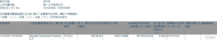 格隆汇1月13日丨根据联交所最新权益披露资料显示,2026年1月7日,第一太平(00142.HK)获Brandes Investment Partners, L.P.在场内以每股均价5.89港元增持78.83万股,涉资约464.31万港元。
