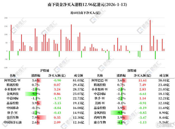 1月13日,南下资金今日净买入港股12.96亿港元。