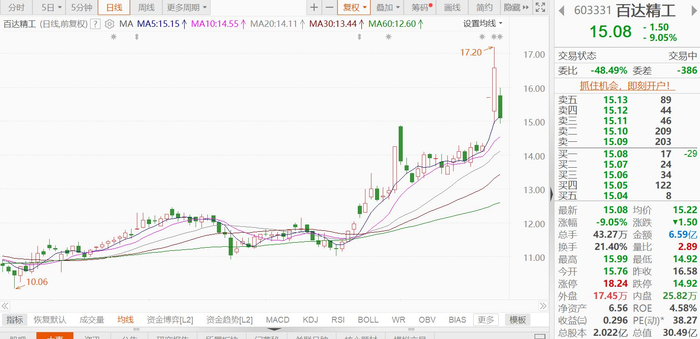 百达精工(603331.SH)跌9.05%,报15.08元,总市值30.49亿元。百达精工公告称,持股5%以上股东杭州重湖私募基金管理有限公司-重湖-云树1号私募证券投资基金因基金投资运作需要,拟通过集中竞价和大宗交易方式合计减持不超过4,043,512股,占公司总股本的2.00%;其中集中竞价减持不超过2,021,756股,大宗交易减持不超过2,021,756股;减持期间为2026年2月26日至2026年5月25日;拟减持股份来源为协议转让取得。