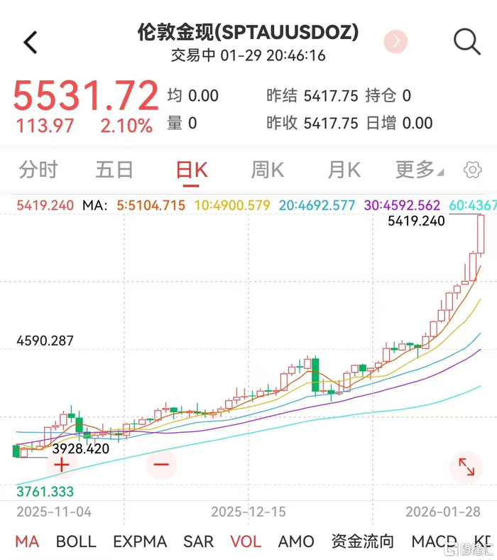 截至目前,现货黄金报5531.72美元/盎司,涨幅为2.1%。