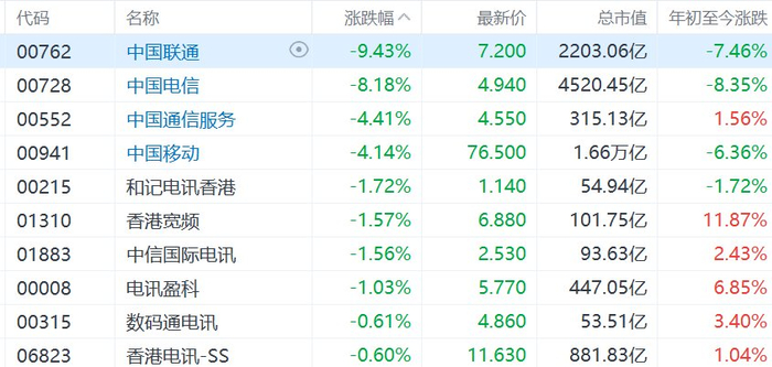 格隆汇2月2日|港股电信股跌幅扩大,三大中资电信股领跌,其中,中国联通跌超9%,中国电信跌超8%,中国移动跌超4%。