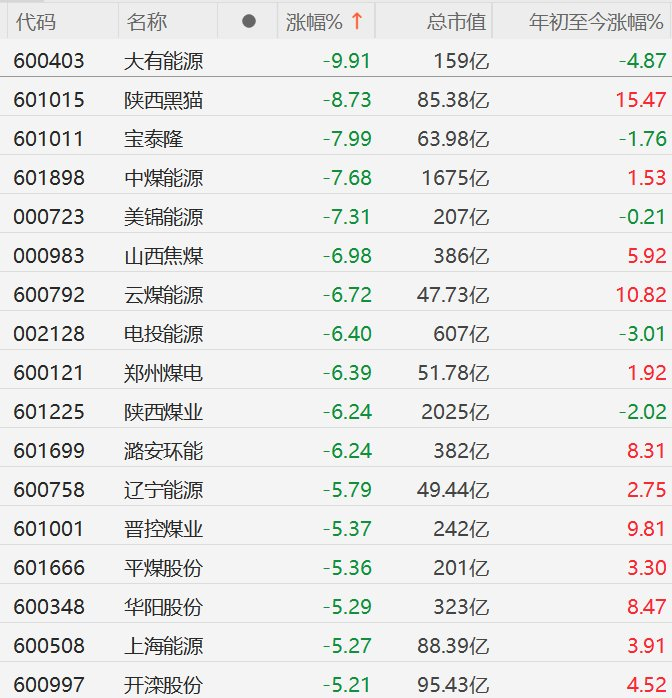 格隆汇2月2日|A股市场煤炭股集体下挫,其中,大有能源触及跌停,陕西黑猫跌超8%,宝泰隆、中煤能源、美锦能源跌超7%,山西焦煤、云煤能源、电投能源、郑州煤电、陕西煤业、潞安环能跌超6%,辽宁能源、晋控煤业、平煤股份、华阳股份、上海能源、开滦股份跌超5%。