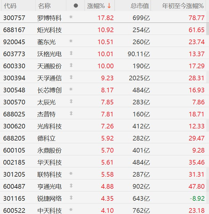 格隆汇2月3日|A股市场CPO概念股再度集体爆发,其中,罗博特科涨超17%,炬光科技、蘅东光涨超10%,沃格光电、天通股份10CM涨停,天孚通信涨超9%,长芯博创涨超8%,太辰光、杰普特、光库科技涨超7%,德科立、永鼎股份、华天科技、联特科技涨超5%。值得注意的是,罗博特科、炬光科技、天孚通信、长芯博创、德科立、亨通光电、蘅东光创历史新高。