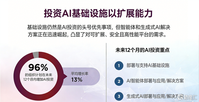报告进一步指出,企业级 AI 的价值正加速从概念验证走向现实落地,窗口期正在不断收紧。调研显示,几乎所有受访者(96%)计划在未来 12 个月内继续增加 AI 投资,平均增长率达 13%;其中,93% 的受访者预计将获得正向投资回报。
