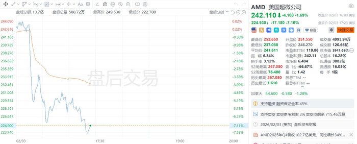 格隆汇2月4日|美国超微半导体(AMD.US)盘后跌逾7%,报224.93美元。超微半导体公布,第四财政季度经营利润录得28.5亿美元,优于分析员预期的24.7亿美元;经调整后每股盈利报1.53美元,胜于市场估计的1.32美元;经营收入录得102.7亿美元,当中包括来自中国的MI308人工智能(AI)芯片销售额3.9亿美元,整体收入好过分析员预期的96.5亿美元。