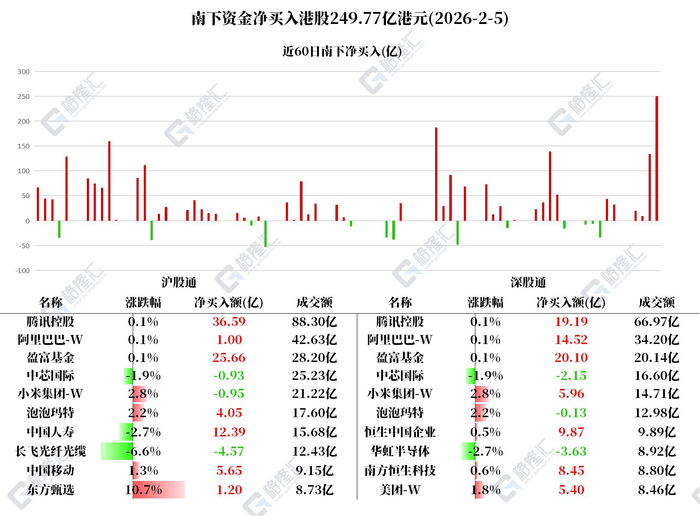 格隆汇2月5日|南下资金今日净买入港股249.77亿港元,创2025年8月15日以来单日最大净买入额。其中: