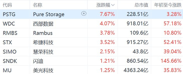 格隆汇2月7日|美股存储概念股普涨,其中,Pure Storage涨超7%,西部数据涨4%,Rambus、希捷科技涨超3%,慧荣科技涨超2%,闪迪、美光科技涨超1%。